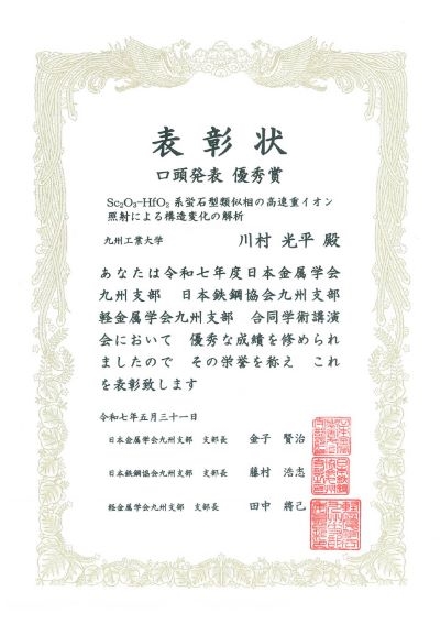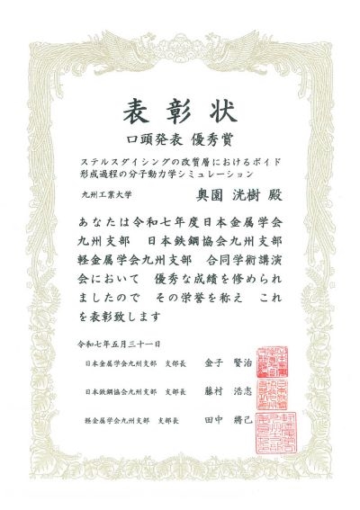 日本金属学会・日本鉄鋼協会・軽金属学会九州支部令和7年度合同学術講演会、北九州国際会議場 (2025.5.31). -